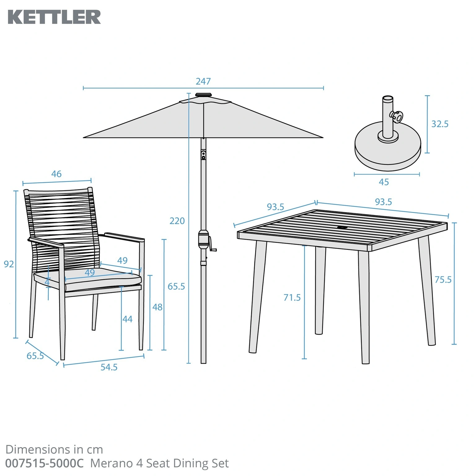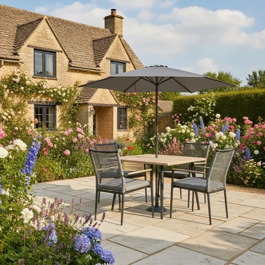 - Complete 4-seat dining set – includes dining table, four cushioned chairs, parasol, and base