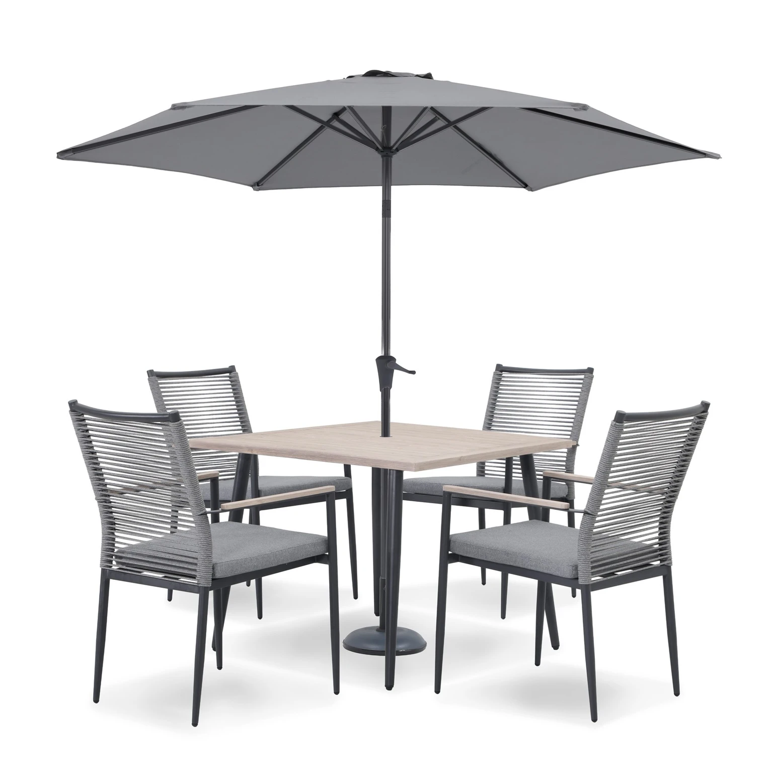 The set features a strong, low-maintenance powder-coated aluminium frame finished in a sleek grey tone, paired with a 90 x 90cm heat-transferred wood-effect slat-top table that offers the charm of natural timber with excellent durability. Rope-detailed dining chairs add contemporary character while remaining lightweight and easy to move. A matching parasol and base are included to provide comfortable shade on sunny days.