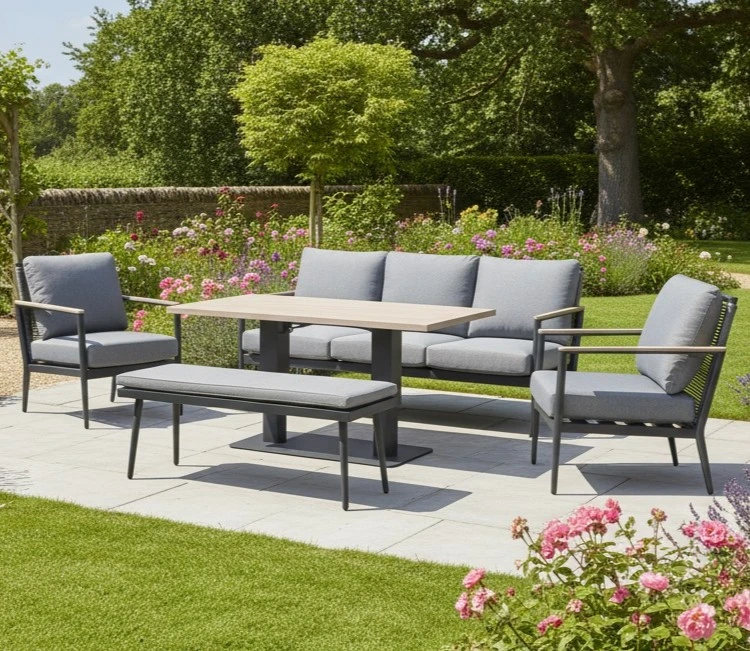 Perfect for versatile outdoor living, the Merano 7 Seat Sofa Set blends dining and lounging in one elegant, contemporary design. Featuring a high/low heat-transferred wood-effect aluminium table with easy one-handed height adjustment, the set transitions effortlessly from relaxed daytime lounging to comfortable outdoor dining.