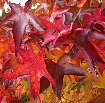 This deciduous tree has shiny green maple-like leaves which turn dark, crimson-red in autumn