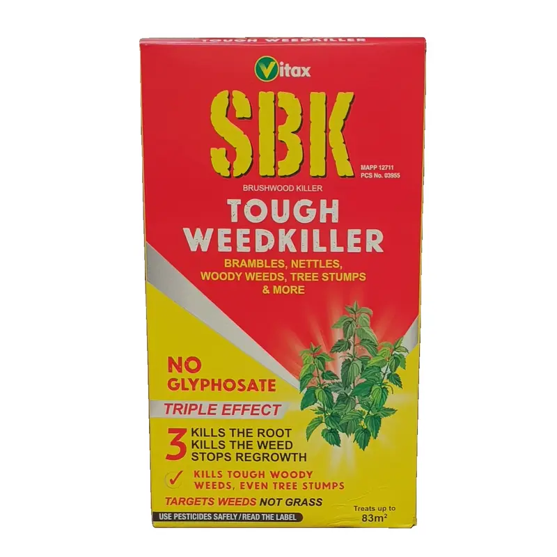 SBK Brushwood Killer Concentrate 250ml controls brambles, thistles, nettles, dock, other tough weeds, woody weeds and hardwood saplings in grassland and other neglected non-crop areas. Also kills tree stumps. Kills difficult weeds not grass. Simply mix with water following pack instructions and apply where needed. Warning:For use only as a home garden weedkiller. Contains triclopyr. May produce an allergic reaction. May cause long lasting harmful effects to aquatic life. Keep out of reach of children and always read instructions before use. Treats up to 83m².